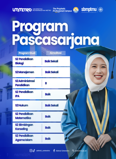 Dapatkan pengalaman belajar terbaik di kampus Profetik Profesional. Dengan Fasilitas Modern, Dosen Kompeten, serta komunitas Mahasiswa dari berbagai negara. Universitas Muhammadiyah Metro akan mengantarkanmu menjadi Generasi Sukses Masa Depan.